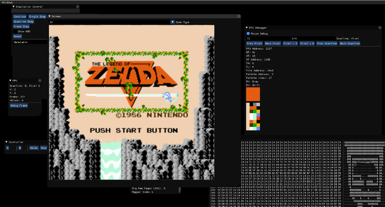 Legend of Zelda emulated plus debugging windows.